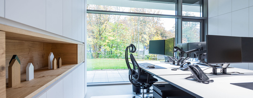 Beinahe hätten wir ein entscheidendes Material vergessen: Glas. Dank seiner bodentiefen Fensterfronten lässt der Gebäudeteil viel Tageslicht ins Innere. Um diesen freundlichen und offenen Charakter nicht zu unterbrechen, haben wir rund 18 Laufmeter Glastrennwände mit einer herausfordernden Höhe von 3,40 m eingezogen. Die Gesamtraumhöhe beträgt sogar 4,40 m. Bleibt also ein ganzer Meter Luft nach oben, um etwas für die Raumakustik zu tun. Hier leistet ein Saum aus schwarz lackierten Akustik-Panels hervorragende Arbeit. Wie gut, dass die kein Homeoffice haben.